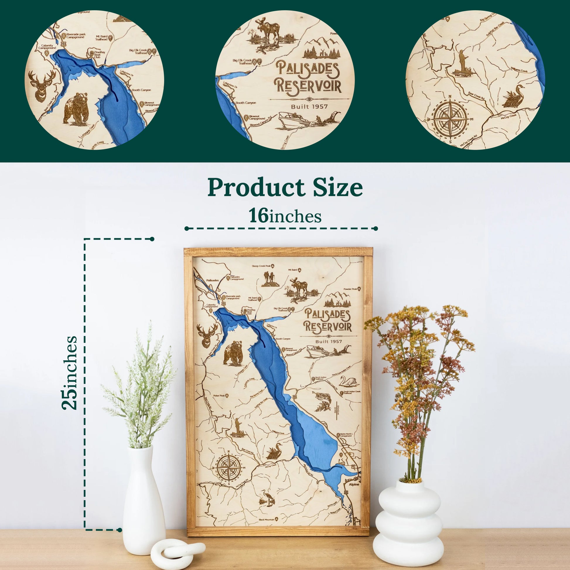 Flowing through the scenic valleys of eastern Idaho and western Wyoming, Palisades Reservoir is a haven for outdoor lovers. This laser-engraved wooden sign beautifully showcases the reservoir’s unique shoreline, surrounding roads, and iconic landmarks, making it a perfect decor piece for cabins, lodges, and lake homes.