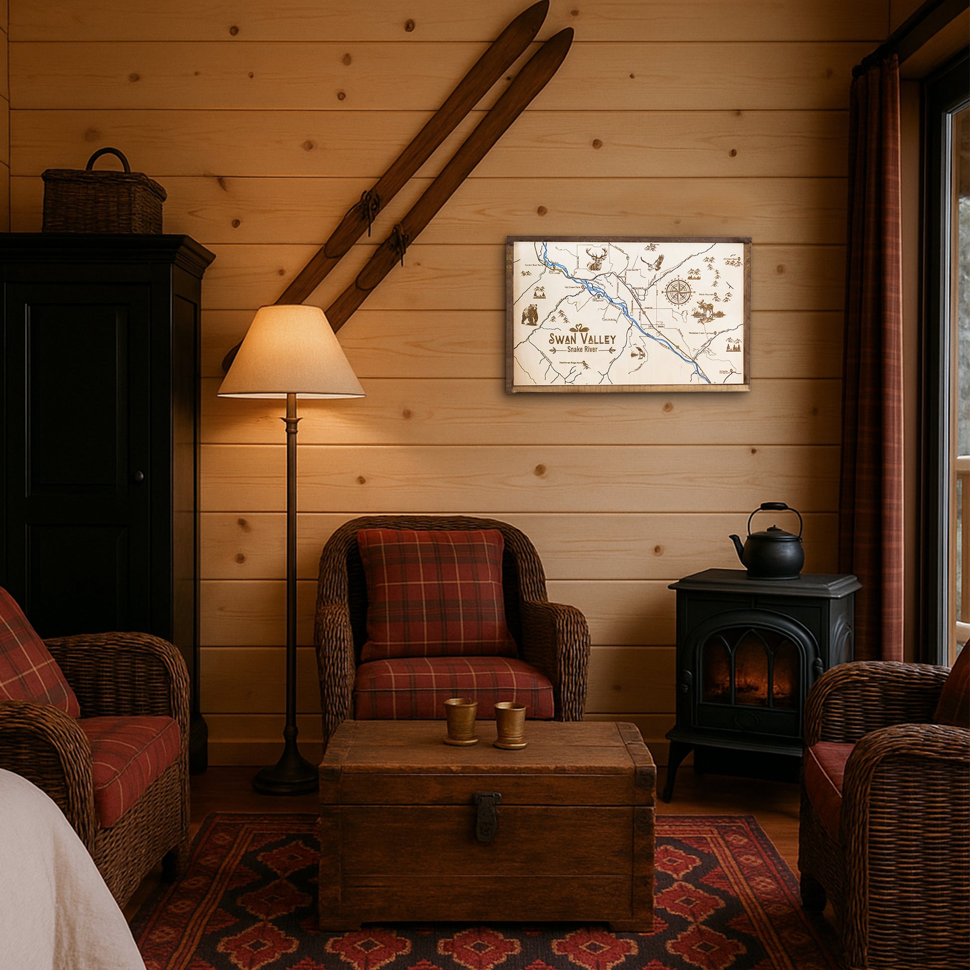 Celebrate the beauty of Swan Valley and the iconic Snake River with this laser-engraved wood sign, meticulously crafted to showcase the natural landmarks, waterways, and terrain of this beloved outdoor destination.