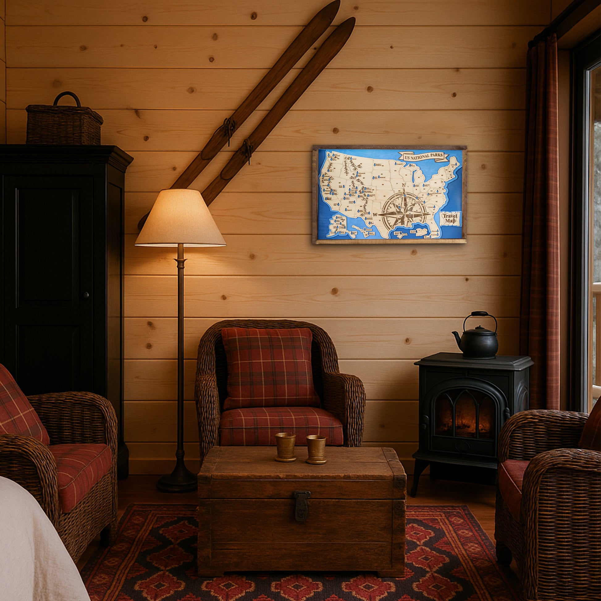 Crafted from premium Baltic birch, this map features precisely engraved park locations, a striking compass rose, and a hand-painted blue backdrop representing the coastlines. The dark-stained frame adds a classic, rustic charm, making it an eye-catching centerpiece for any home, office, or cabin.